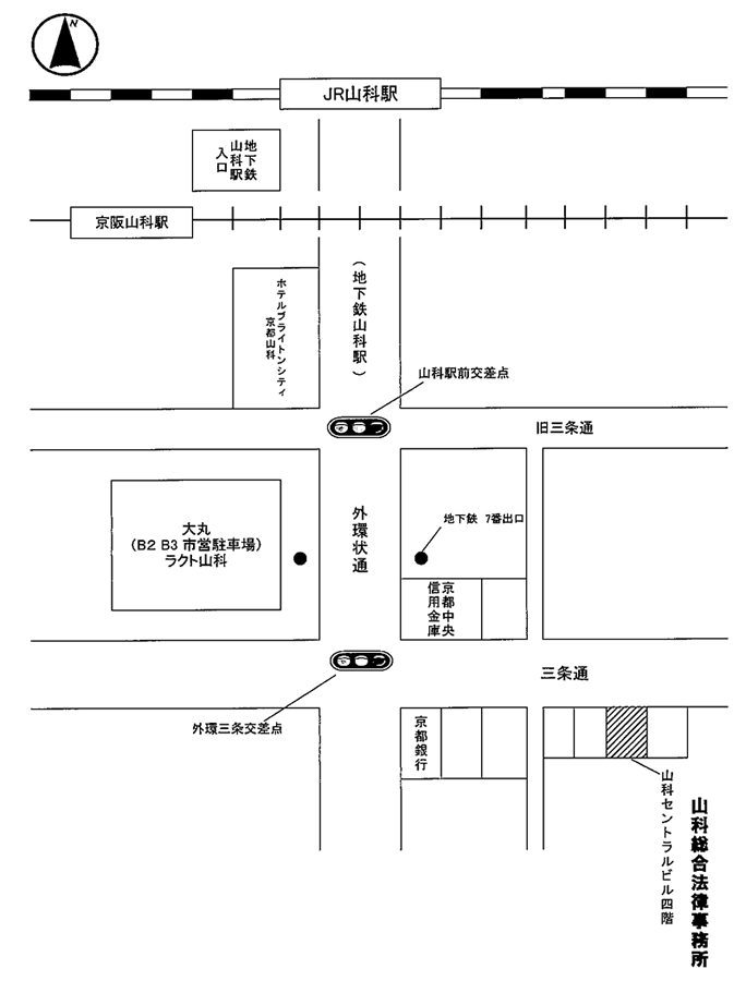 - 三条通り(旧国道)を東へ進むと右手が山科総合法律事務所(山科セントラルビル4階)です。